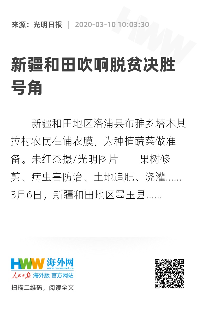 刚刚出台的《墨玉县三农领域工作分工细化方案》,要求在做好疫情防控工作的同时,扎实推进林果业管理、饲草料种植、设施农业发展、庭院改造、生产资料和物资调运等工作的有序开展,确保全县按时完成春耕备耕工作。