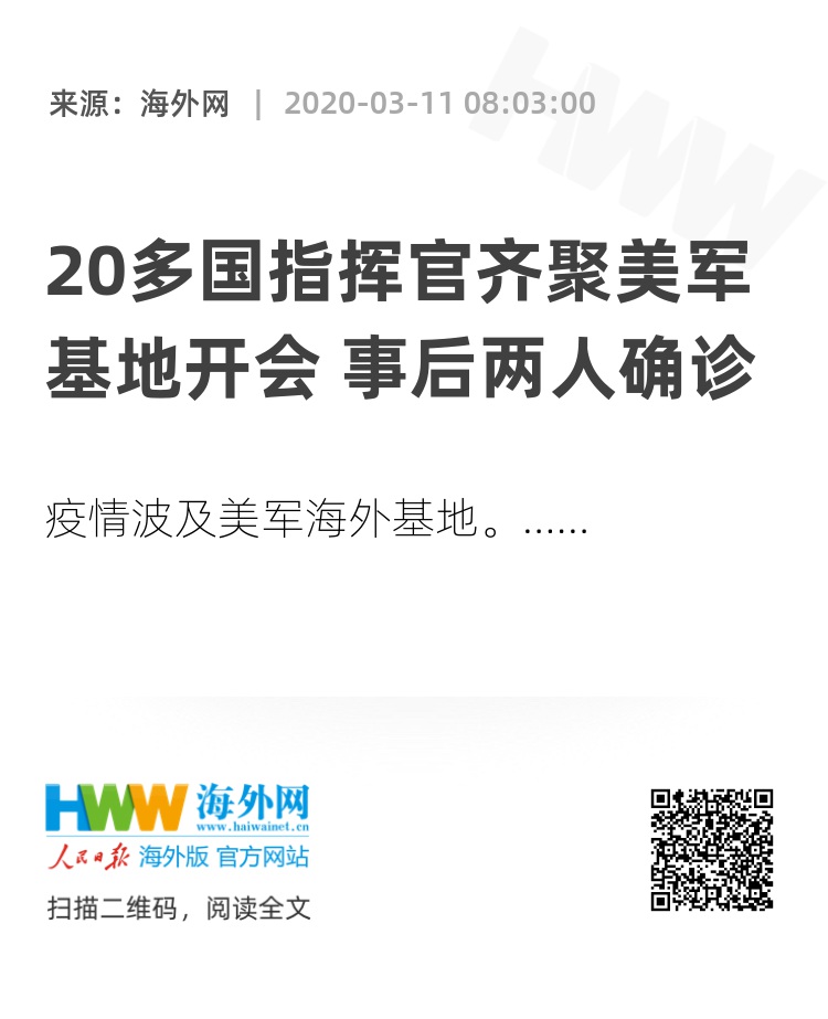 【海外网|战疫全时区】据美联社10日报道,当地时间6日,位于德国威斯巴登的美军基地召开会议,与会人员包括北约各欧洲成员国的陆军指挥官。然而,会议结束后,两名参会者确诊新冠肺炎。