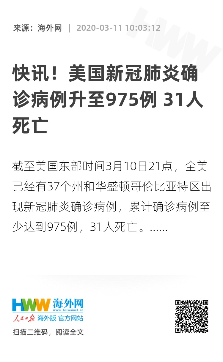 【海外网3月11日|战疫全时区】据CNN最新报道,截至美国东部时间3月10日21点,全美已经有37个州和华盛顿哥伦比亚特区出现新冠肺炎确诊病例,累计确诊病例至少达到975例,31人死亡。