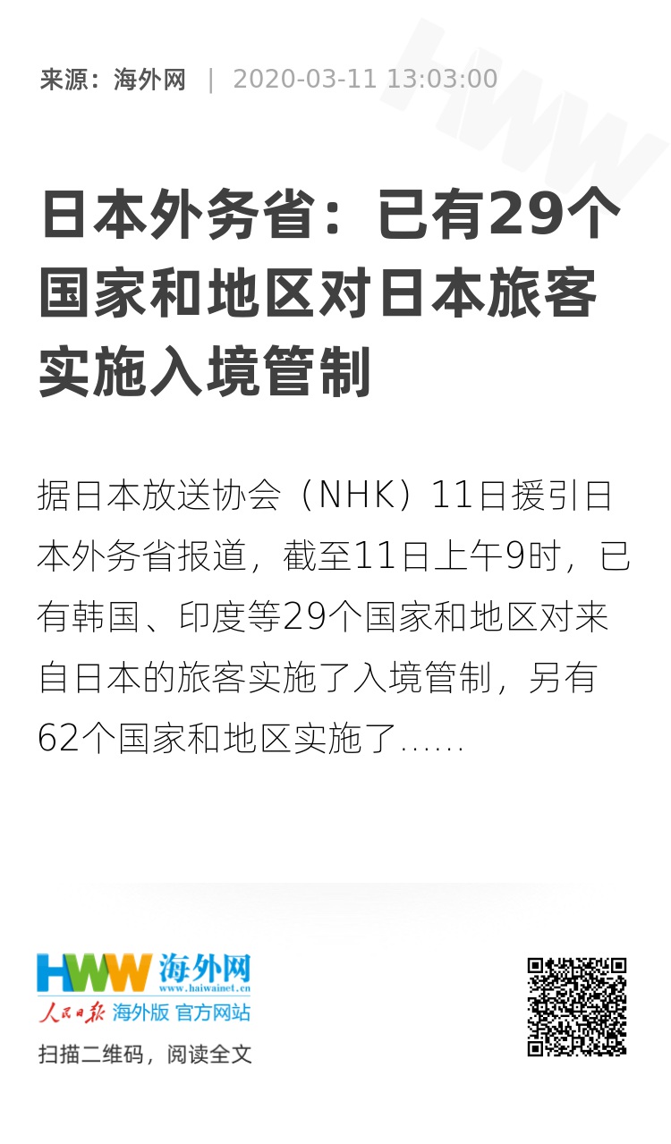 【海外网3月11日|战疫全时区】据日本放送协会(NHK)11日援引日本外务省报道,截至11日上午9时,已有韩国、印度等29个国家和地区对来自日本的旅客实施了入境管制,另有62个国家和地区实施了入境限制(如强制隔离健康观察等)。(海外网 王西洛)