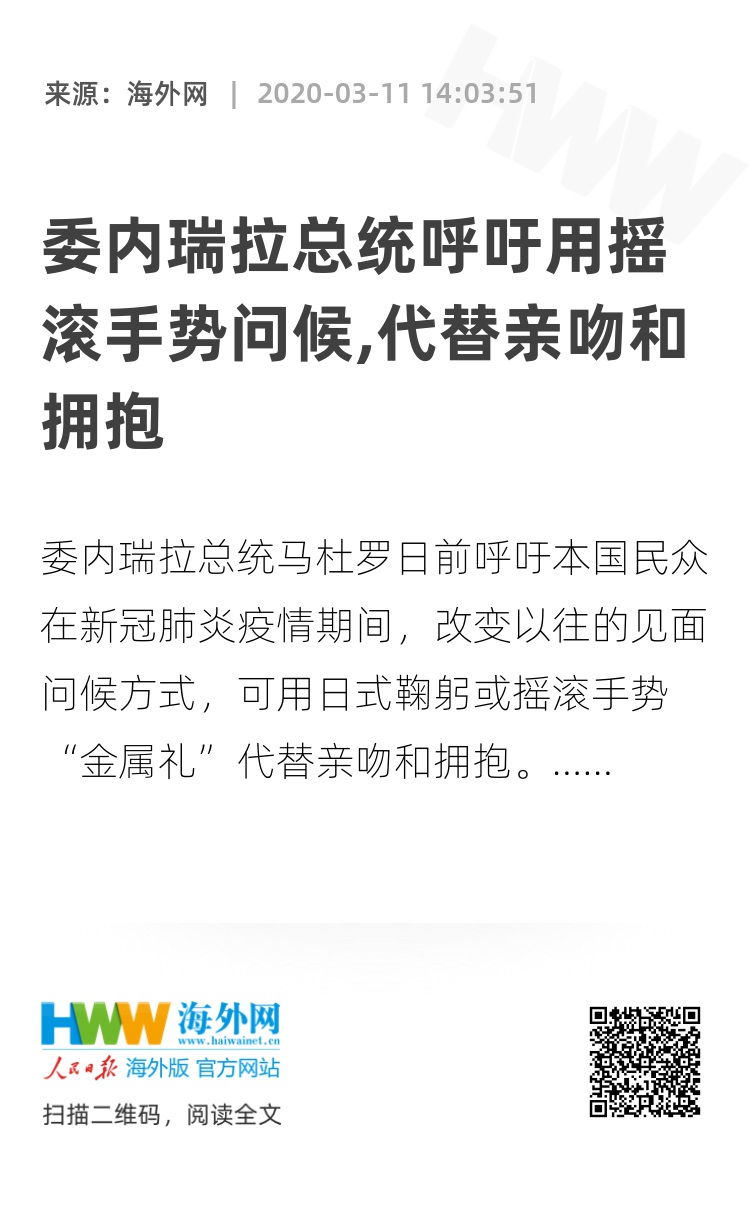 【海外网3月11日|战疫全时区】俄罗斯卫星通讯社11日消息称,委内瑞拉总统马杜罗日前呼吁本国民众在新冠肺炎疫情期间,改变以往的见面问候方式,可用日式鞠躬或摇滚手势 “金属礼”代替亲吻和拥抱。