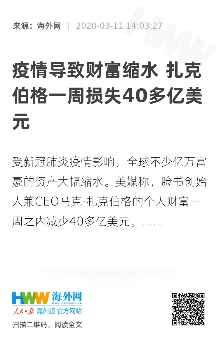 【海外网3月11日|战疫全时区】受新冠肺炎疫情影响,全球不少亿万富豪的资产大幅缩水。美媒称,脸书公司创始人、首席执行官马克·扎克伯格的个人财富一周之内减少40多亿美元。