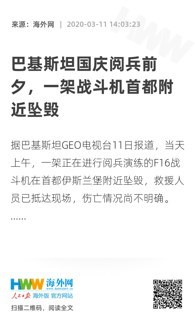 【海外网3月11日编译报道】据巴基斯坦GEO电视台11日报道,当天上午,一架正在进行阅兵演练的F16战斗机在首都伊斯兰堡附近坠毁,救援人员已抵达现场,伤亡情况尚不明确。(海外网 王西洛)