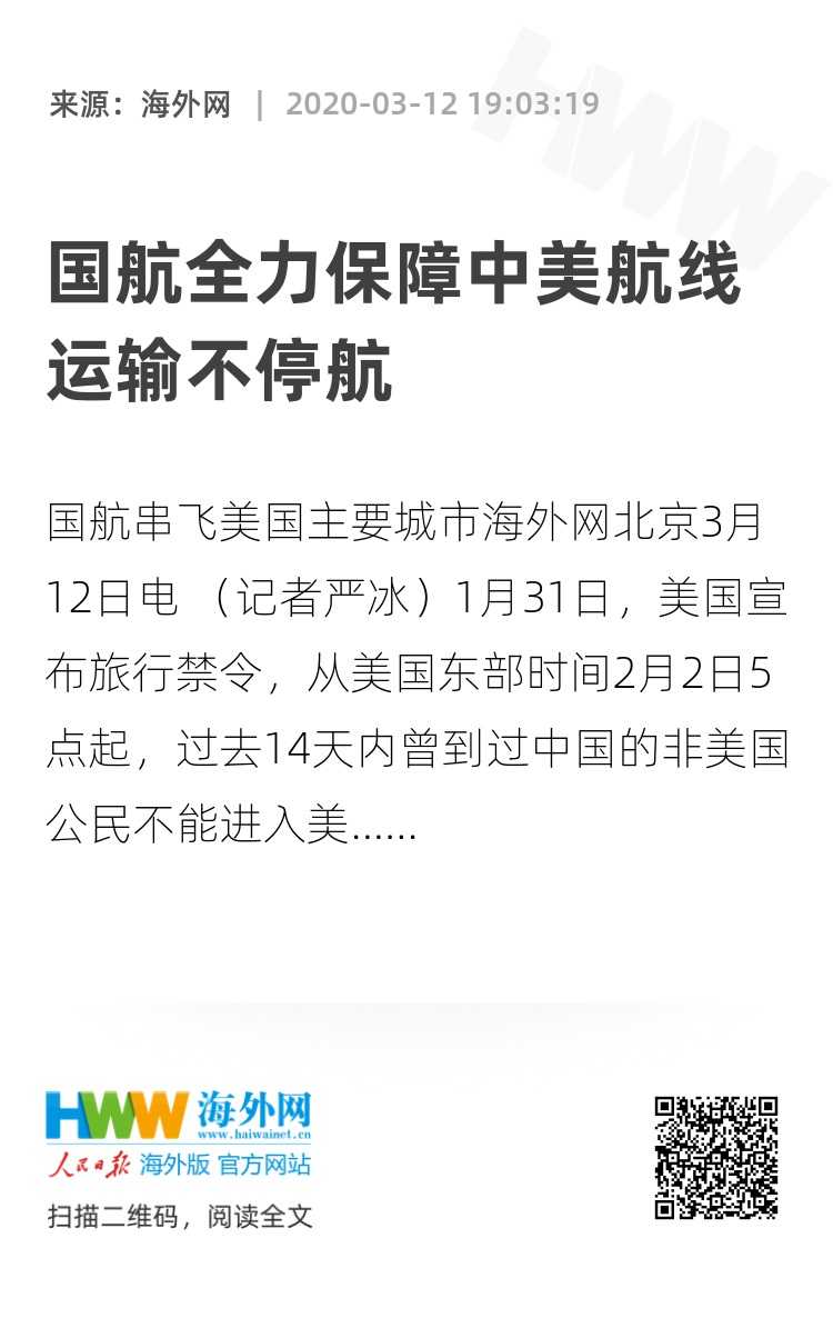 海外网北京3月12日电 (记者严冰)1月31日,美国宣布旅行禁令,从美国东部时间2月2日5点起,过去14天内曾到过中国的非美国公民不能进入美国境内,多家美国航空公司也暂停了中美之间的航班。在这种情况下,国航承担起中美之间不停航的任务,保持美国主要城市与中国之间通航,采用串飞航点,尽可能覆盖更多的城市来满足各地旅客的需求。