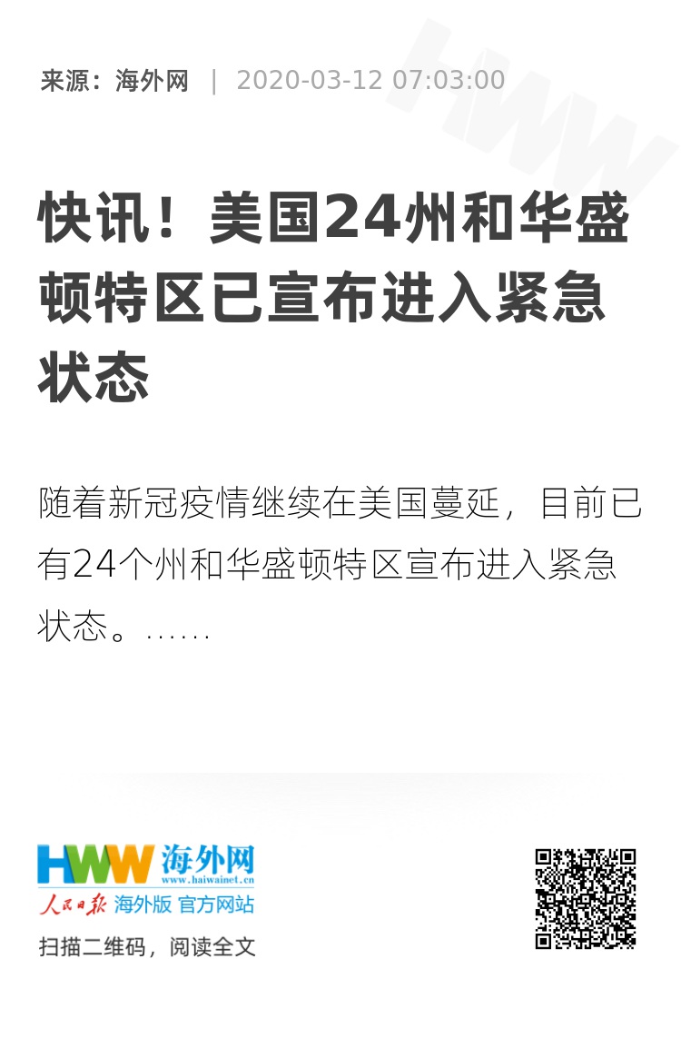 【海外网3月12日|战疫全时区】据美国有线电视新闻网报道,随着新冠疫情继续在美国蔓延,目前已有24个州和华盛顿特区宣布进入紧急状态。