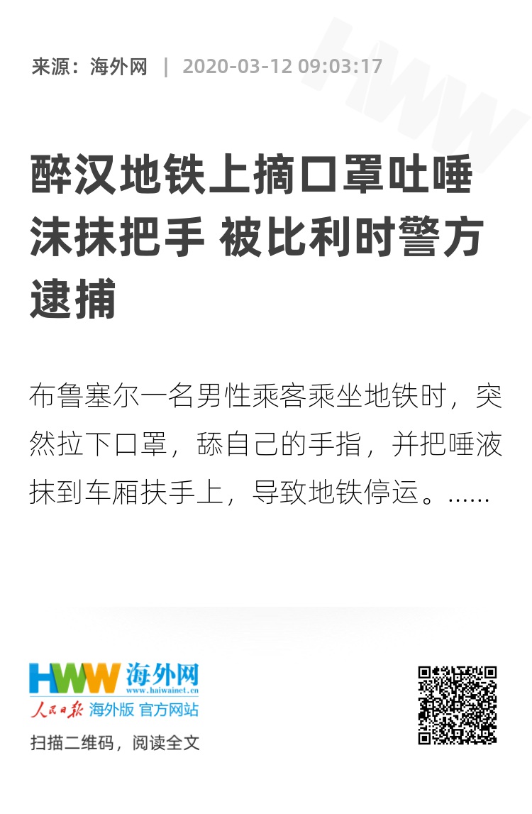 【海外网3月12日|战疫全时区】据《太阳报》11日报道,布鲁塞尔一名男性乘客乘坐地铁时,突然拉下口罩,舔自己的手指,并把唾液抹到车厢扶手上,导致地铁停运,男子随后被逮捕。