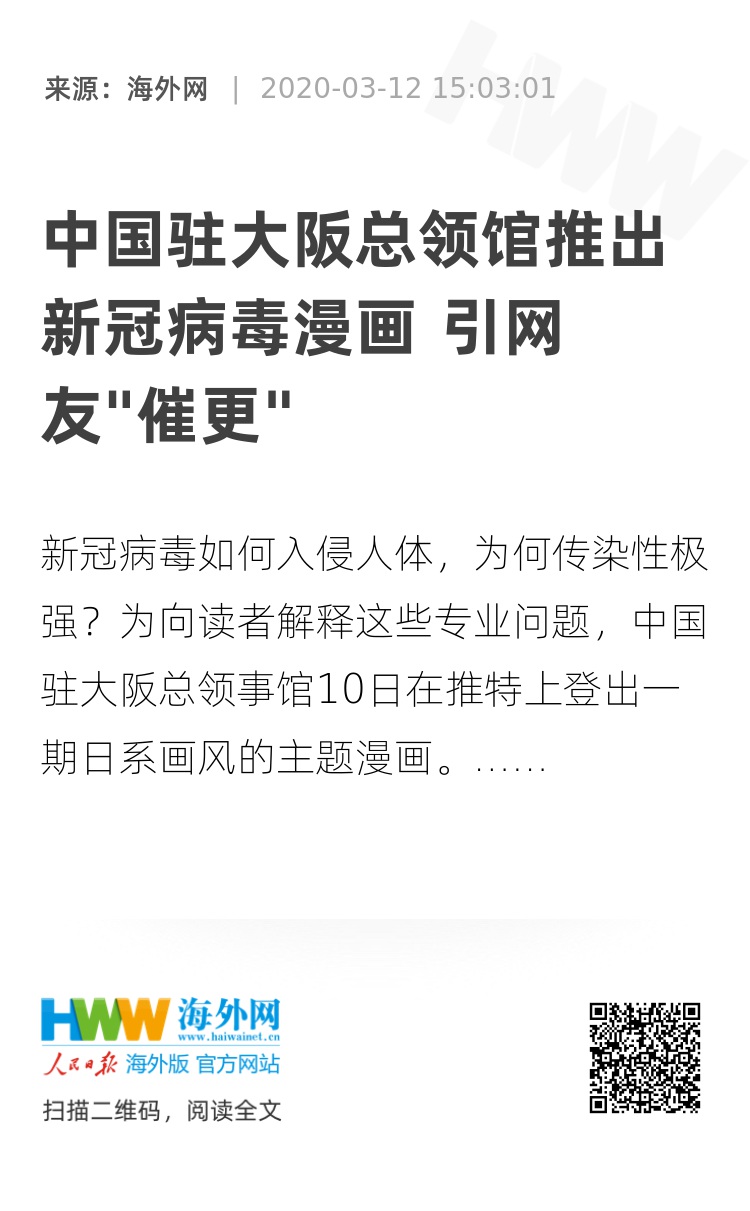 【海外网3月12日|战疫全时区】新冠病毒如何入侵人体,为何传染性极强?为向读者解释这些专业问题,中国驻大阪总领事馆10日在推特上登出一期日系画风的主题漫画,科普病毒对人体的影响。这种“二次元”画风的科普形式引来网友一片点赞,甚至有人在下面“催更”,盼望尽快推出下一期。