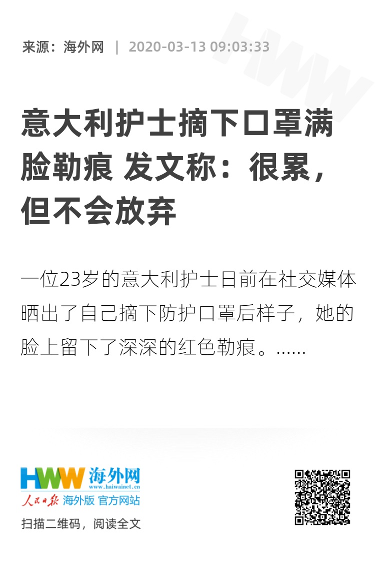 【海外网3月13日|战疫全时区】由于新冠肺炎疫情在意大利持续蔓延,身处一线的医护人员正在与病毒进行着抗争。一位23岁的意大利护士日前在社交媒体晒出了自己摘下防护口罩后样子,她的脸上留下了深深的红色勒痕。