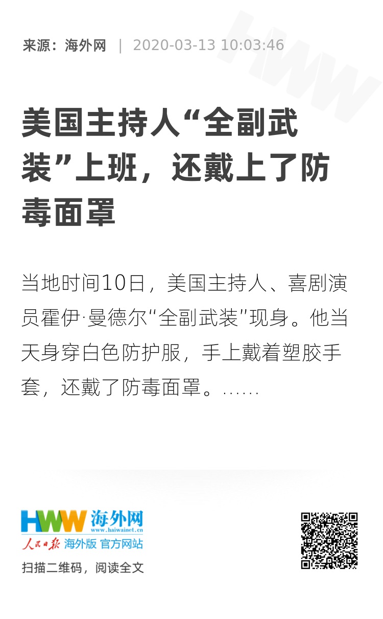 【海外网3月13日|战疫全时区】当地时间10日,美国主持人、喜剧演员霍伊·曼德尔(Howie Mandel)“全副武装”现身。他当天身穿白色防护服,手上戴着塑胶手套,还戴了防毒面罩,前去参加《美国达人秀》节目的录制。