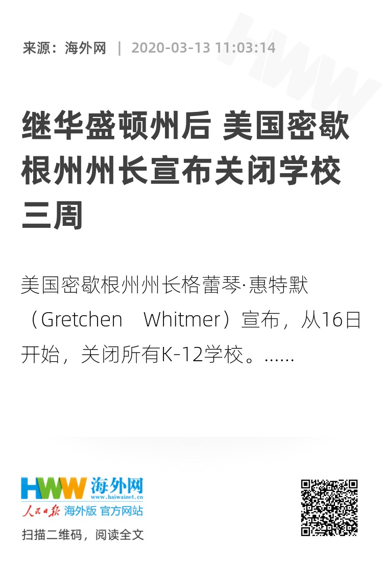 【海外网3月13日|战疫全时区】当地时间12日,美国密歇根州州长格蕾琴·惠特默(Gretchen Whitmer)宣布,从16日开始,关闭所有K-12学校,包括公立,私立和寄宿制,直到4月5日。