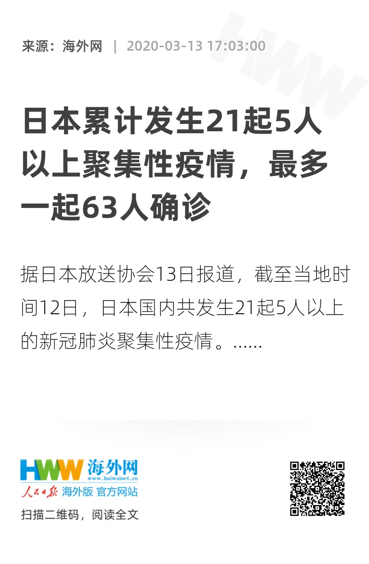 【海外网3月13日|战疫全时区】据日本放送协会13日报道,截至当地时间12日,日本国内共发生21起5人以上的新冠肺炎聚集性疫情。其中,发生在大阪市一处小型现场演出场所的聚集性疫情,已有至少63人确诊。