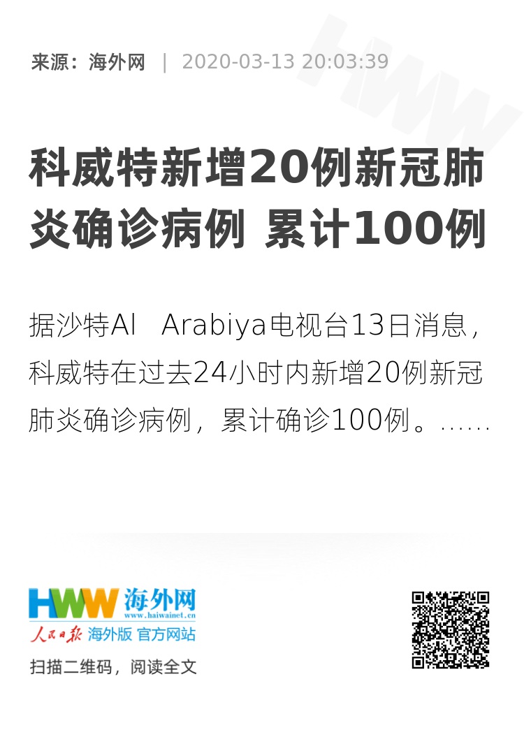 【海外网快讯】据沙特Al Arabiya电视台13日消息,科威特在过去24小时内新增20例新冠肺炎确诊病例,累计确诊100例。(海外网 王珊宁)