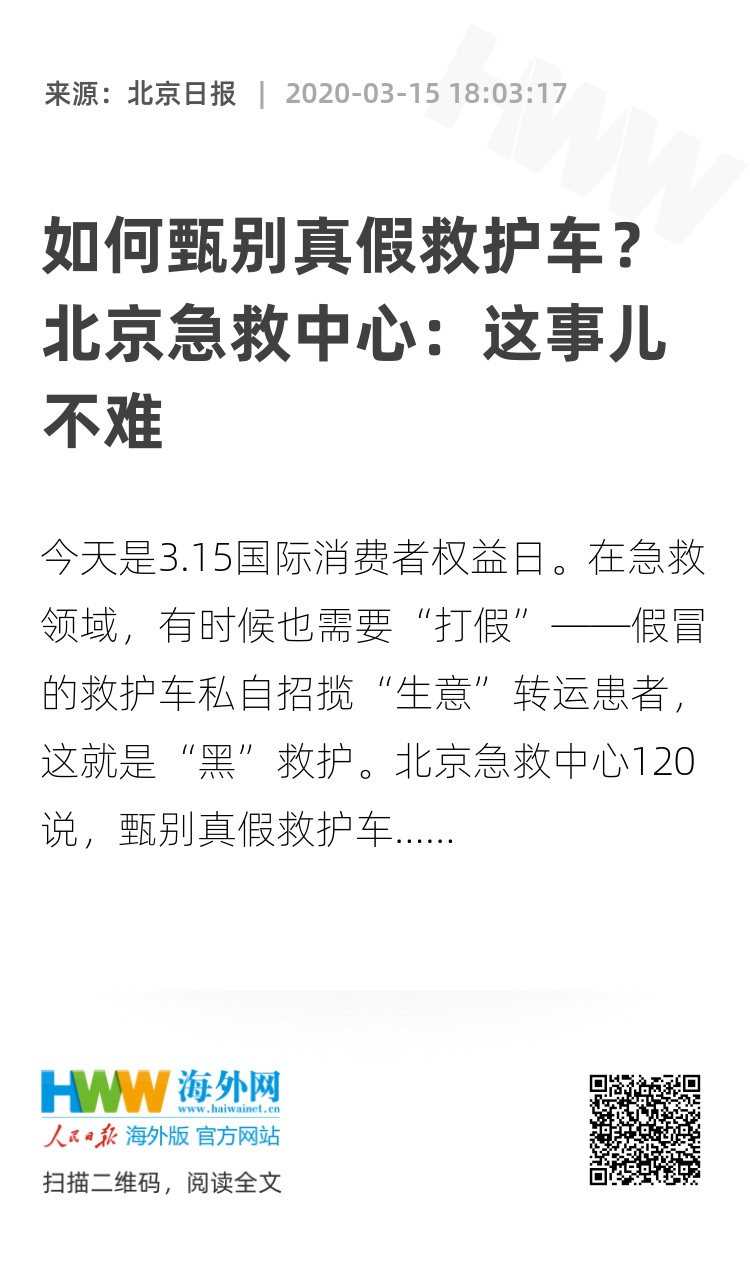 北京急救中心120提醒市民,如果需要使用救护车,不要轻信街边广告或者“朋友”介绍,应该直接拨打120,寻求正规专业的救治转运服务,才能保证患者的生命健康。