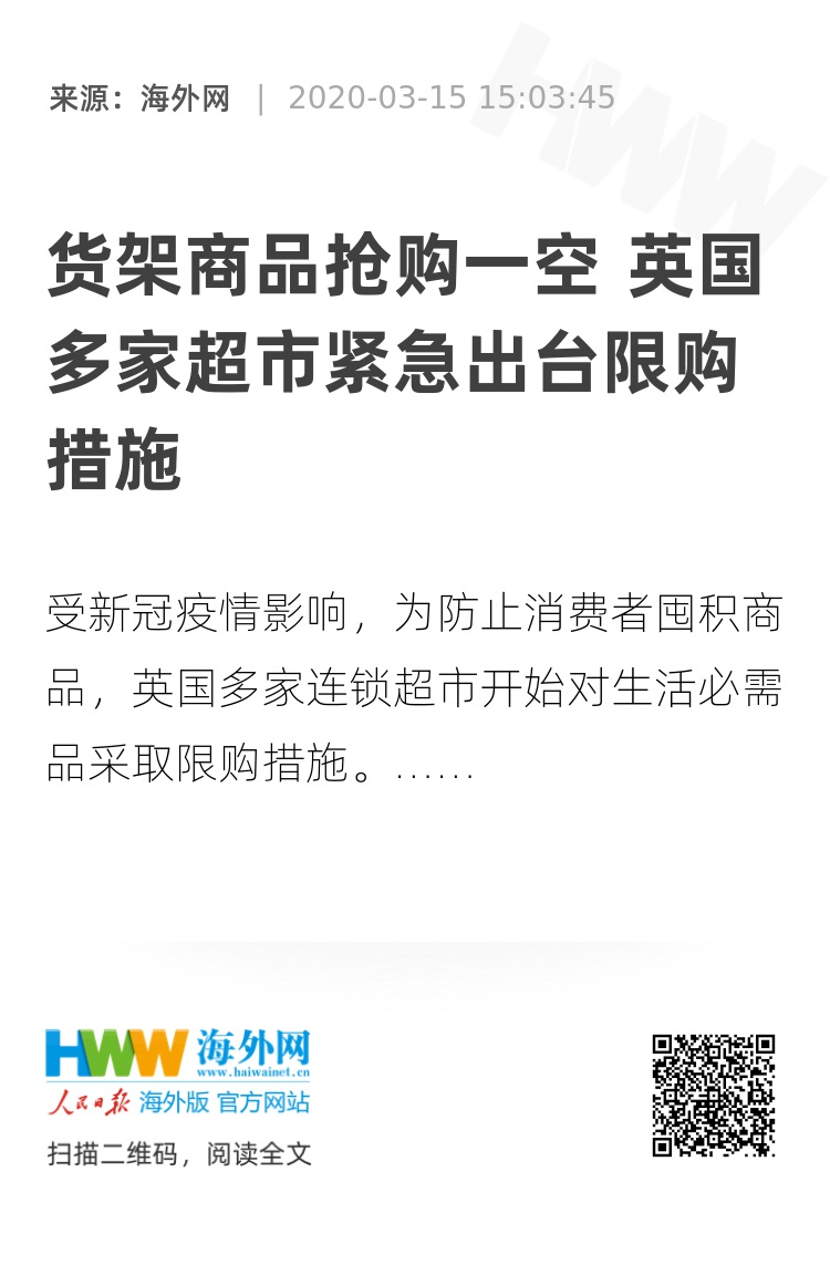 【海外网3月15日|战疫全时区】受新冠疫情影响,为防止消费者囤积商品,从当地时间3月14日起,英国多家连锁超市开始对生活必需品采取限购措施。限购商品包括卫生纸、抗菌洗手液、抗菌喷雾、面食和罐头食品等。