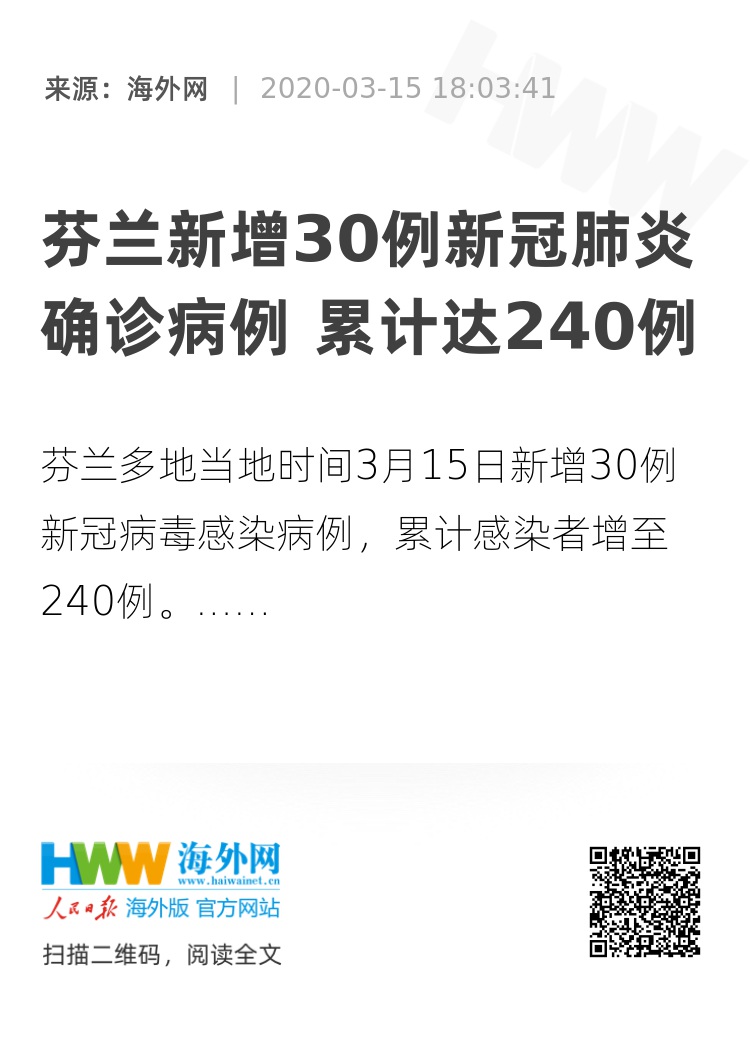 【海外网3月15日|战疫全时区】据《芬兰日报》15日报道,芬兰国家健康和福利研究所(THL)表示,芬兰多地当地时间3月15日新增30例新冠病毒感染病例,累计感染者增至240例。
