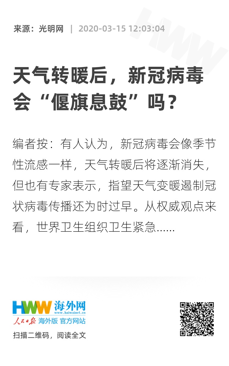 有人认为,新冠病毒会像季节性流感一样,天气转暖后将逐渐消失,但也有专家表示,指望天气变暖遏制冠状病毒传播还为时过早。