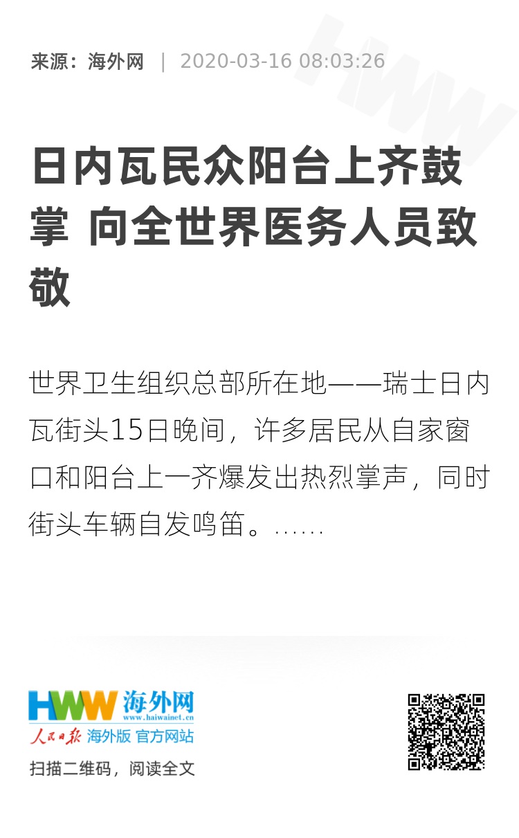 【海外网3月16日|战疫全时区】当地时间15日晚间,世界卫生组织总部所在地——瑞士日内瓦,许多居民从自家窗口和阳台上一齐爆发出热烈掌声,同时街头车辆自发鸣笛,向为抗击新冠肺炎疫情而奋战在一线的全世界医疗从业者,及为公共场所杀菌清扫的人士致敬。