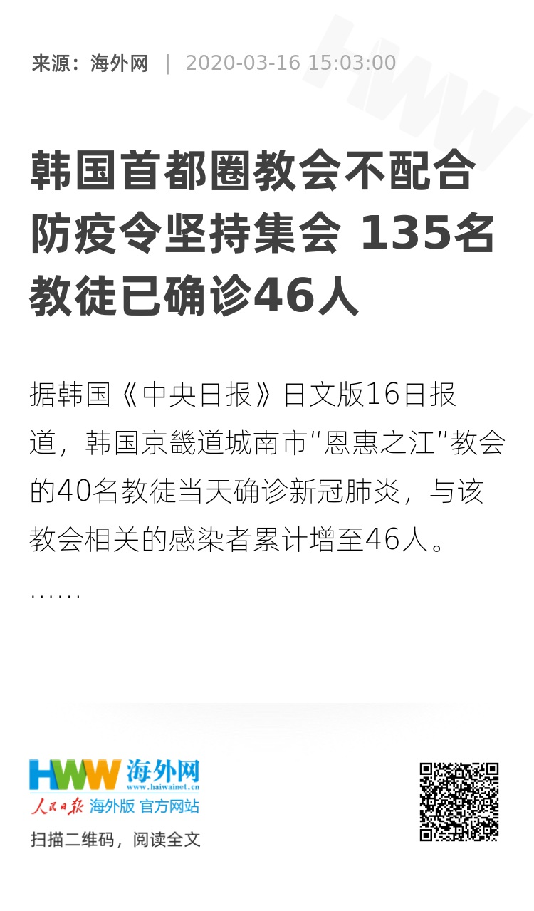 【海外网3月16日|战疫全时区】据韩国《中央日报》日文版16日报道,韩国京畿道城南市“恩惠之江”教会的40名教徒当天确诊新冠肺炎,与该教会相关的感染者累计增至46人。