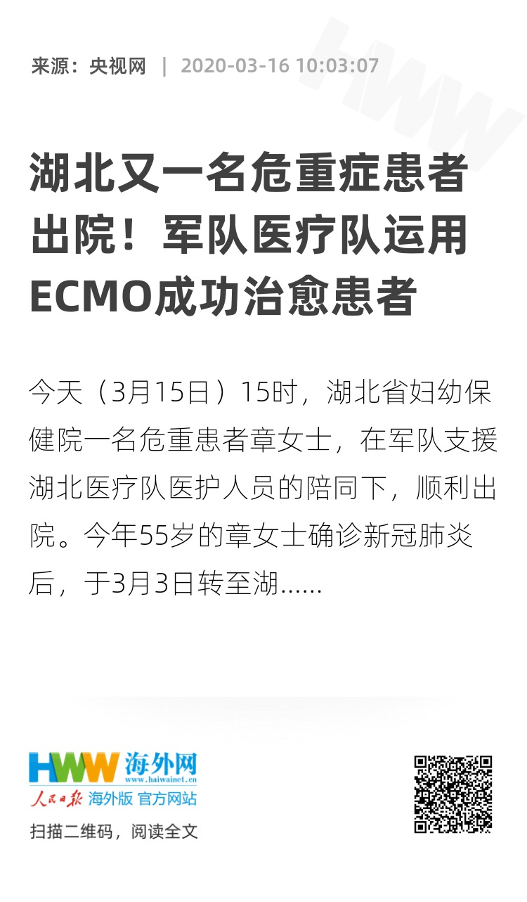 今天(3月15日)15时,湖北省妇幼保健院一名危重患者章女士,在军队支援湖北医疗队医护人员的陪同下,顺利出院。