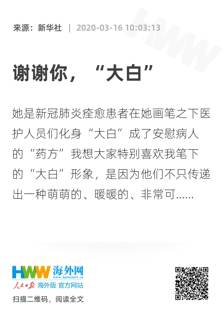 我想大家特别喜欢我笔下的“大白”形象,是因为他们不只传递出一种萌萌的、暖暖的、非常可爱的医护人员形象,从我的这些画里,他们可以感受到有一种生机,有一种生命力。