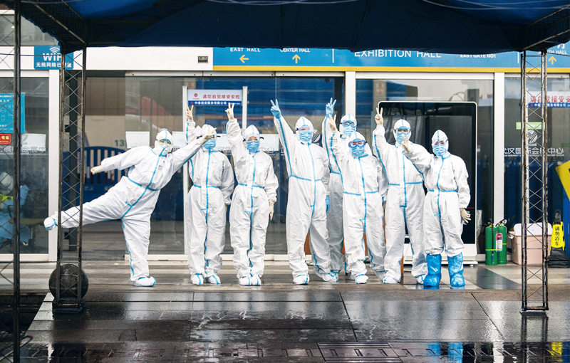2020年3月10日,随着武昌方舱医院的医护人员送走最后一批康复出院的新冠肺炎轻症患者,武汉市方舱医院全部完成使命,宣布休舱。图为江汉方舱医院的医疗队员出舱后合影。 新华社记者 费茂华/摄
