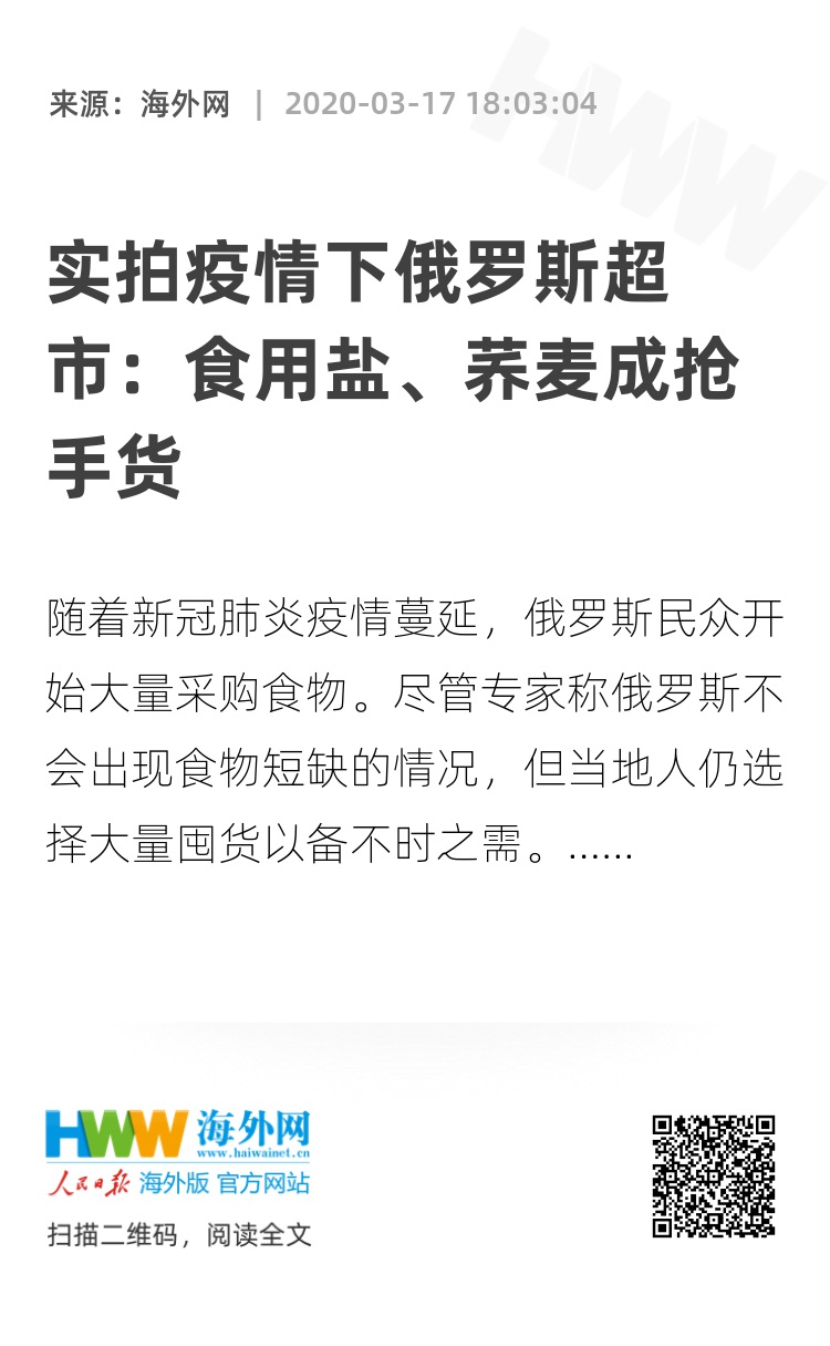 【海外网3月17日|战疫全时区】随着新冠肺炎疫情蔓延,俄罗斯民众开始大量采购食物。尽管专家称俄罗斯不会出现食物短缺的情况,但当地人仍选择大量囤货以备不时之需。俄媒日前拍下了一组俄罗斯超市被“抢空”照片。