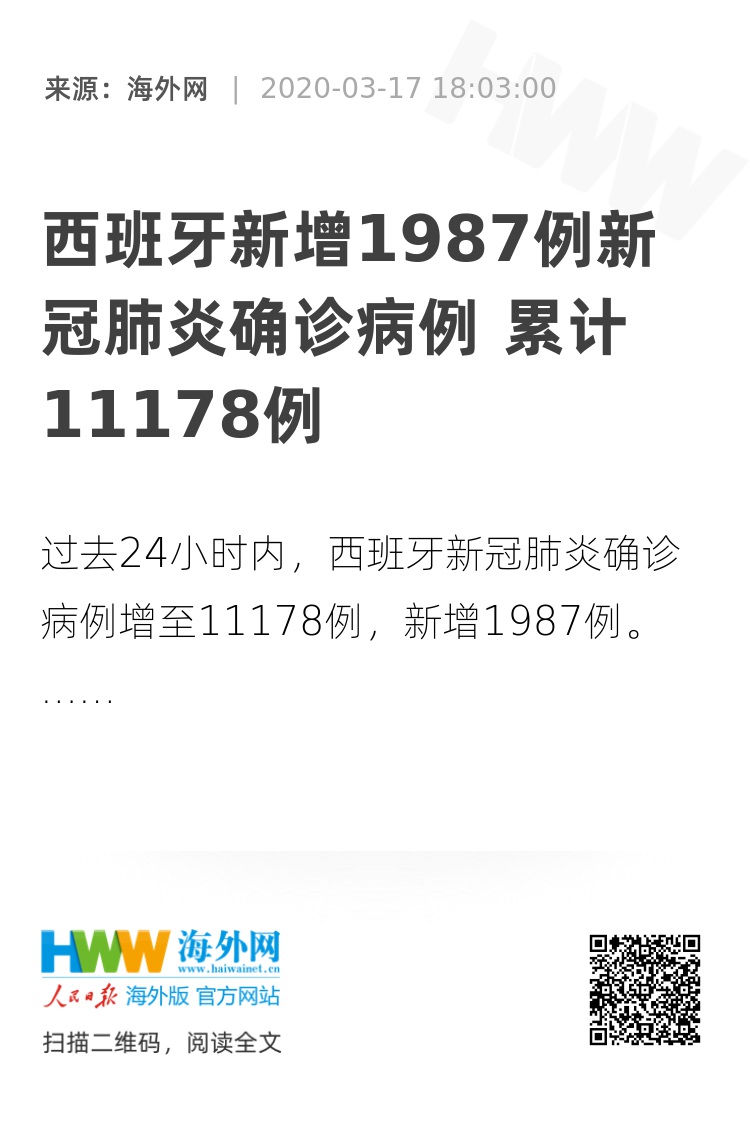 【海外网3月17日|战疫全时区】据西班牙广播电视台17日报道,过去24小时内,西班牙新冠肺炎确诊病例增至11178例,新增1987例,死亡491例。(海外网 吴倩)