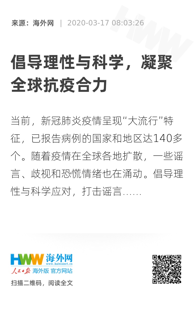 当前,新冠肺炎疫情呈现“大流行”特征,已报告病例的国家和地区达140多个。随着疫情在全球各地扩散,一些谣言、歧视和恐慌情绪也在涌动。倡导理性与科学应对,打击谣言和虚假信息,阻止“信息病毒”,也成为全球共同打赢疫情防控阻击战、凝聚抗击疫情合力的重要内容。