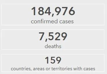 世卫组织实时统计数据显示,截至欧洲中部时间17日16时(北京时间17日23时),全球新冠肺炎确诊病例累计达到184976例,死亡病例7529例 ,已报告病例的国家和地区达159个。