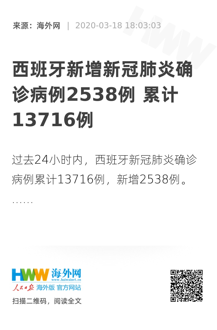 【海外网3月18日|战疫全时区】据西班牙《世界报》援引该国卫生部数据,过去24小时内,西班牙新冠肺炎确诊病例累计13716例,新增2538例,累计死亡558例,新增死亡49例,累计治愈1081例。目前有5717名患者入院治疗,占确诊总数的42%,其中774例在重症监护室。(海外网 魏雪巍)