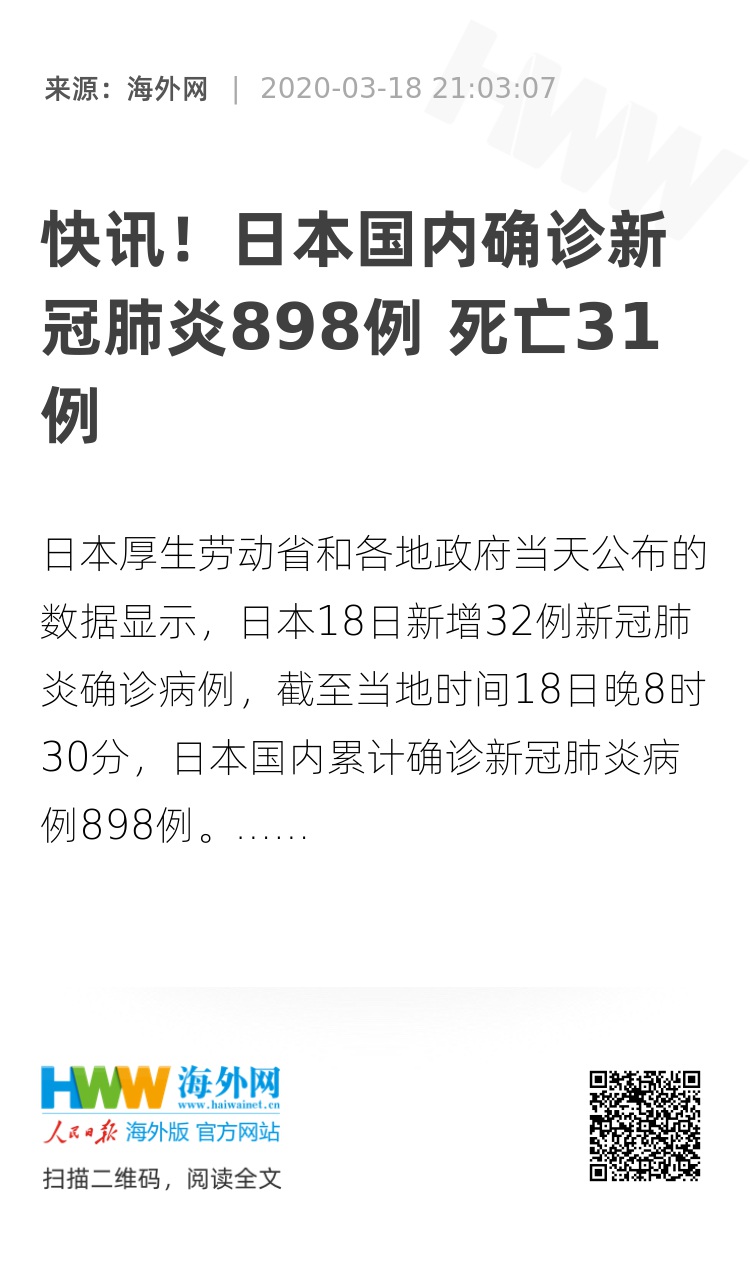 【海外网3月18日|战疫全时区】据日本放送协会(NHK)18日消息,日本厚生劳动省和各地政府当天公布的数据显示,日本18日新增32例新冠肺炎确诊病例,截至当地时间18日晚8时30分,日本国内累计确诊新冠肺炎病例898例。