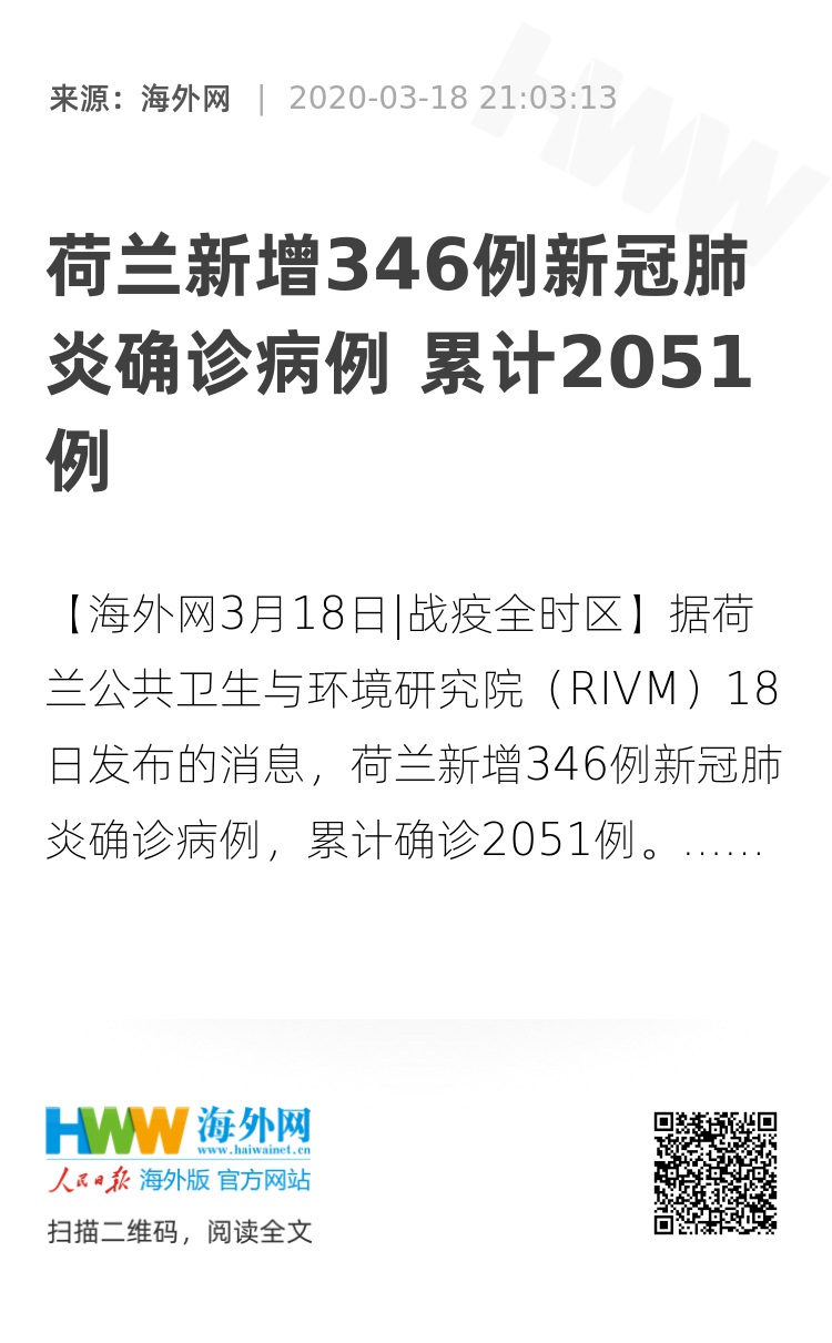 【海外网3月18日|战疫全时区】据荷兰公共卫生与环境研究院(RIVM)18日发布的消息,荷兰新增346例新冠肺炎确诊病例,累计确诊2051例。