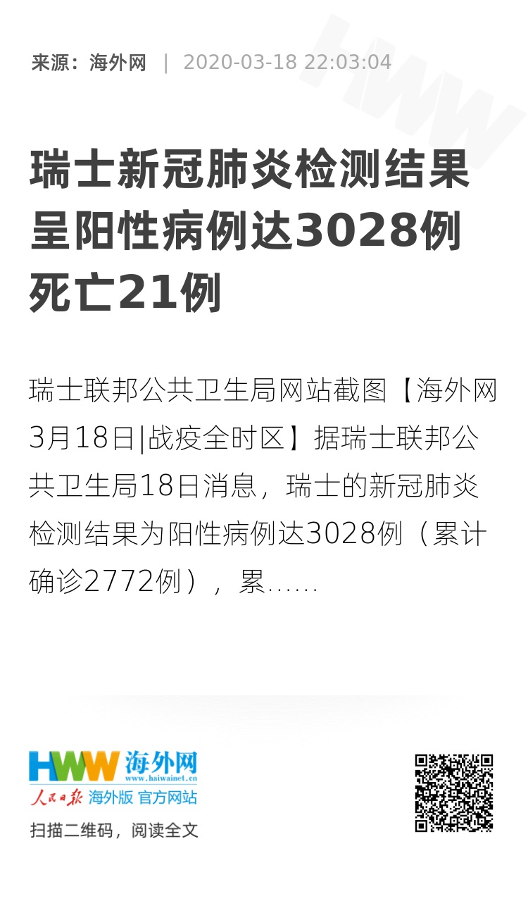 【海外网3月18日|战疫全时区】据瑞士联邦公共卫生局18日消息,瑞士的新冠肺炎检测结果为阳性病例达3028例(累计确诊2772例),累计死亡病例21例。(海外网 王珊宁)