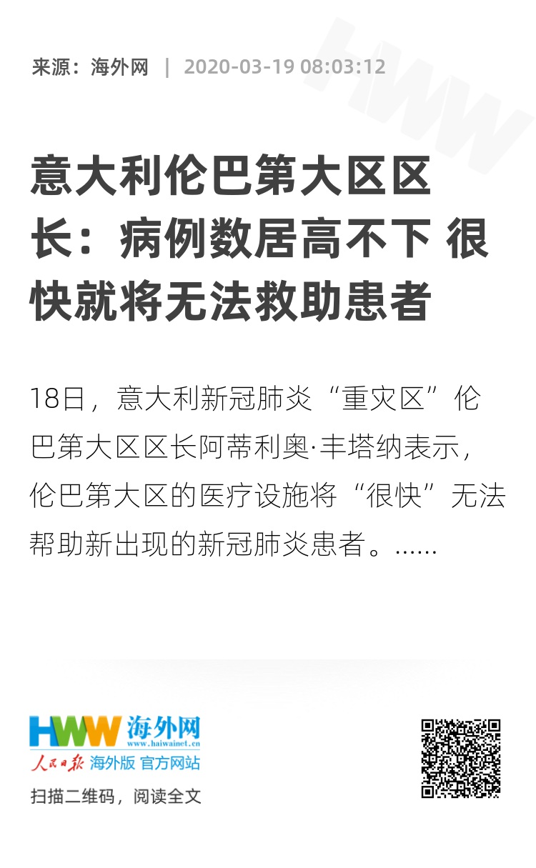 【海外网3月19日|战疫全时区】当地时间18日,意大利新冠肺炎“重灾区”伦巴第大区区长阿蒂利奥·丰塔纳表示,伦巴第大区的医疗设施将“很快”无法帮助新出现的新冠肺炎患者,他敦促该区的所有人待在家里。