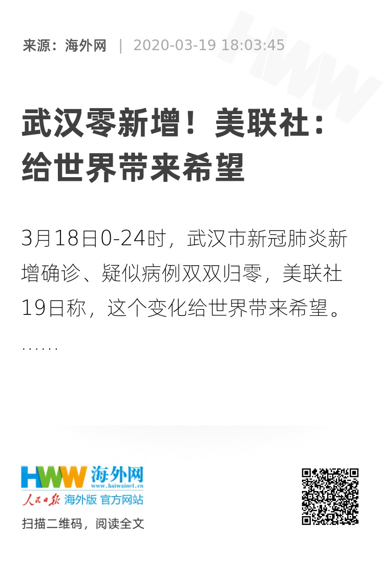 在一篇题为《武汉零新增 给世界带来希望》的文章中,美联社提到,上个月的疫情高峰期内,武汉几乎每天都有上千新增病例,但这座城市3月18日新增确诊病例为0例,这是个巨大的变化,显示如今疫情暴发的严重地已向欧洲和美国转移。