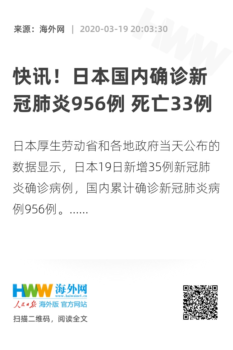 【海外网3月19日|战疫全时区】据日本放送协会(NHK)19日消息,日本厚生劳动省和各地政府当天公布的数据显示,日本19日新增35例新冠肺炎确诊病例,截至当地时间19日晚8时30分,日本国内累计确诊新冠肺炎病例956例。