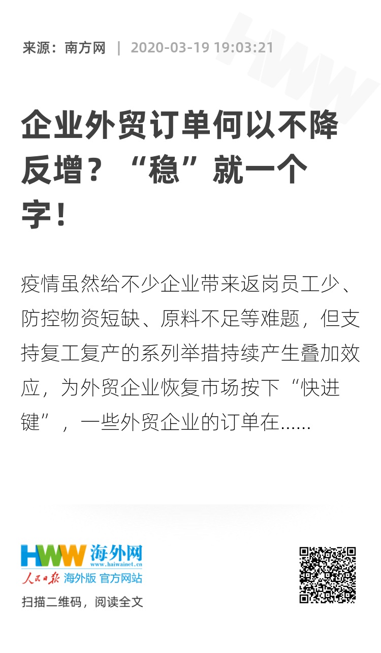 疫情影响下,一些企业的外贸订单何以能不降反增,答案就在于:稳外贸,“稳”就一个字。