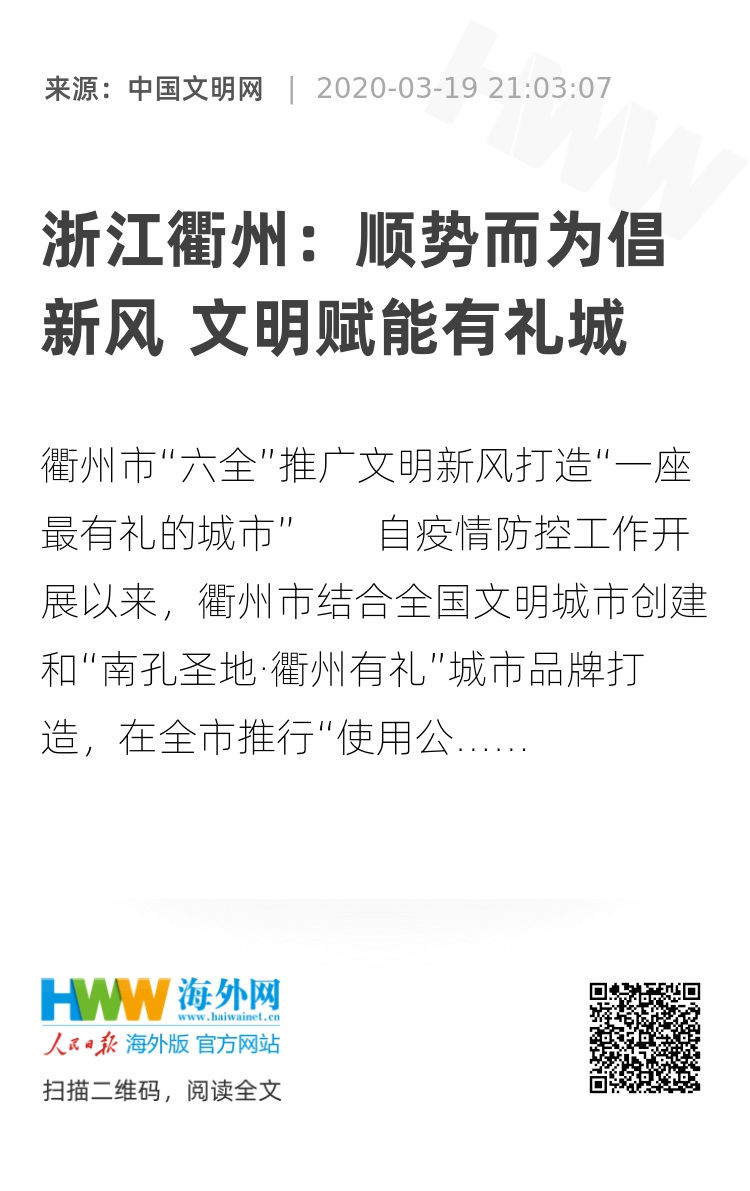 自疫情防控工作开展以来,衢州市结合全国文明城市创建和“南孔圣地·衢州有礼”城市品牌打造,在全市推行“使用公筷、行作揖礼、不随地吐痰”等文明新风,全面提升市民文明素养和城市文明程度,全力打造“一座最有礼的城市”。