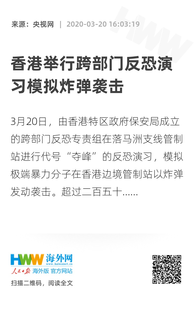 警方希望通过演习,让公众了解极端暴力手段对公共安全的严重威胁,提高市民大众对可疑物品的警惕和防范,并加强警队各部门与专责组成员部门处理爆炸品的协调和应变能力,切实保障市民生命财产的安全。(总台央视记者 金东 冯良辰)