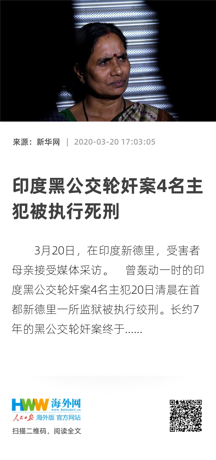 3月20日,在印度新德里,受害者母亲接受媒体采访。 曾轰动一时的印度黑公交轮奸案4名主犯20日清晨在首都新德里一所监狱被执行绞刑。长约7年的黑公交轮奸案终于尘埃落定。 新华社发(帕塔·萨卡尔摄)