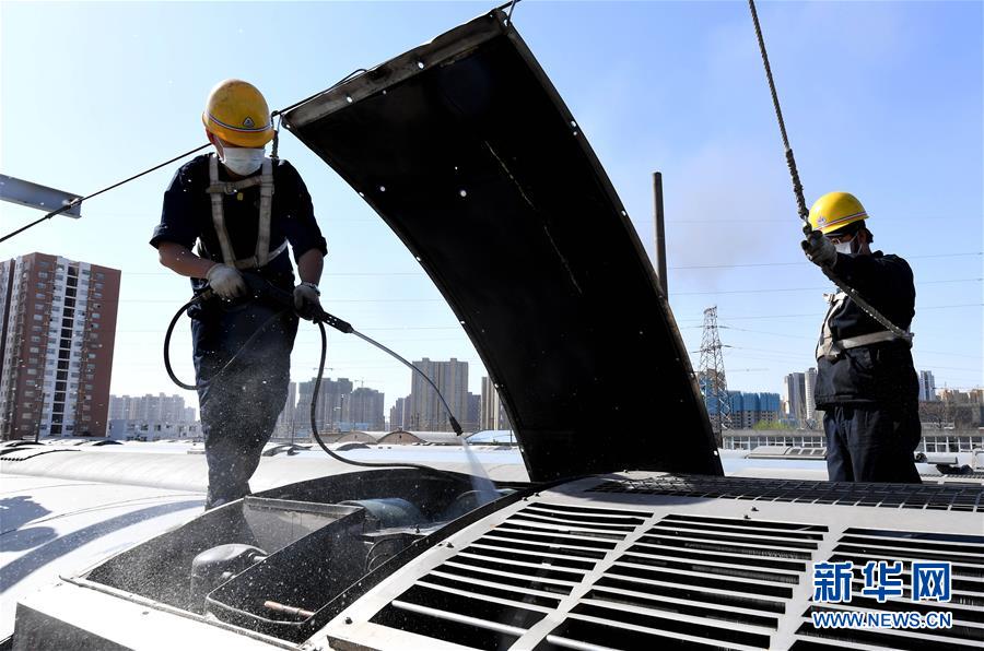 3月19日,郑州车辆段客车检车员在对客车空调机组蒸发器、压缩机等内部设备进行清洗。新华社记者 李安 摄
