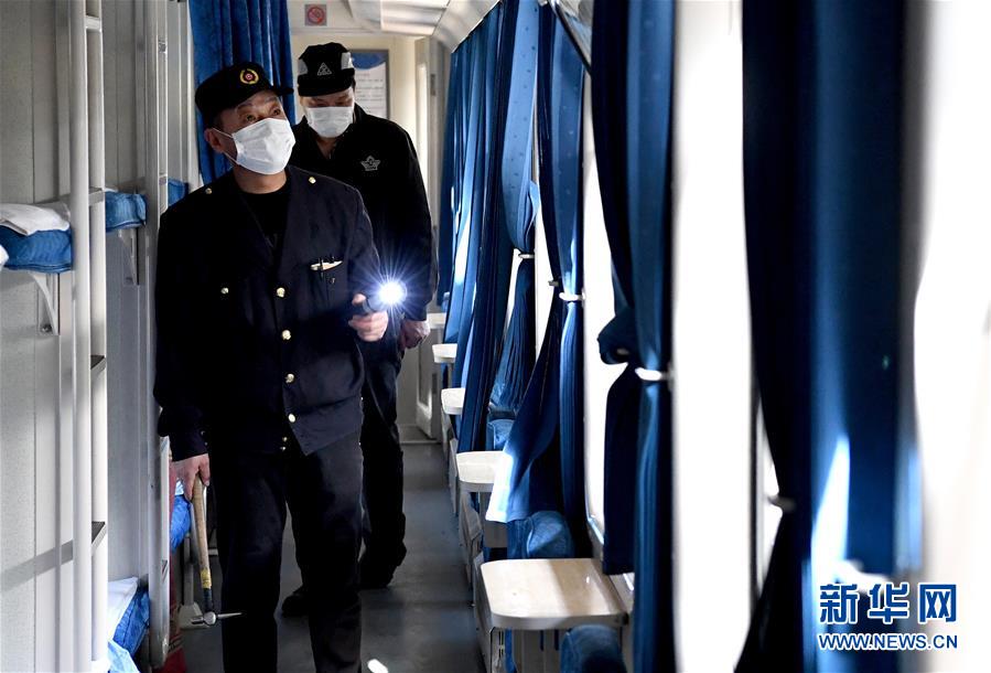 3月19日,郑州车辆段客车检车员王东亮(前)和刘凯在对客车上部设施的状态进行检查和记录。新华社记者 李安 摄