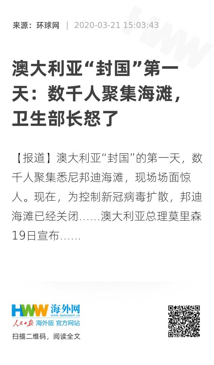 澳大利亚总理莫里森19日宣布,从当地时间20日晚21点起,对所有非澳大利亚公民和非永久居民执行旅行禁令。据路透社报道,20日当天,数千人依旧涌到邦迪海滩。