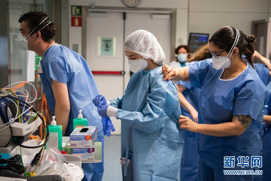 3月20日,在西班牙巴塞罗那一家医院内,医务人员穿戴防护服。新华社发(弗朗西斯科·阿维亚 摄)