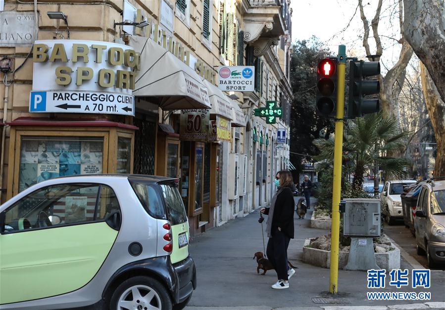 3月20日,在意大利首都罗马,一名女子戴着口罩遛狗。 新华社记者 程婷婷 摄