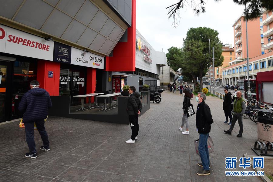 3月20日,在意大利博洛尼亚,人们在超市外保持较大间距排队等待购物。 新华社发(詹尼·斯基基摄)