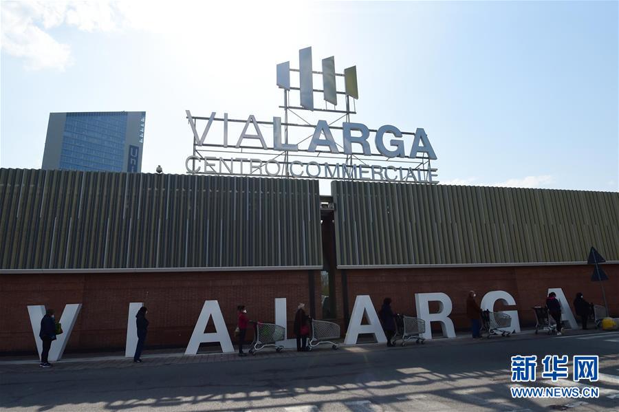 3月20日,在意大利博洛尼亚,人们在超市外保持较大间距排队等待购物。新华社发(詹尼·斯基基摄)