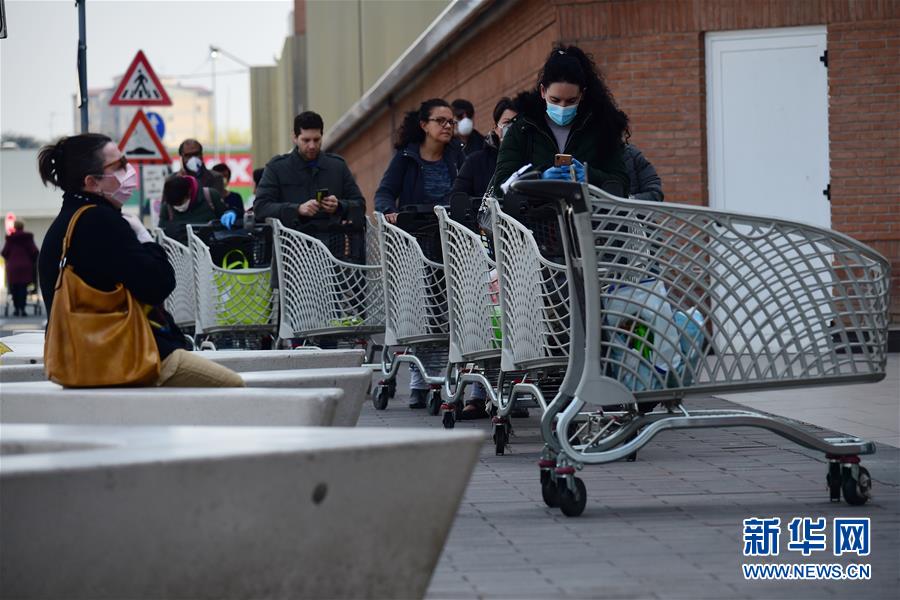 3月20日,在意大利博洛尼亚,人们在超市外排队等待购物。意大利民事保护部门负责人、新冠病毒应急委员会专员博雷利20日说,截至当天18时,意大利累计新冠肺炎确诊病例升至47021例,病亡者增至4032人,另有5129人治愈。新华社发(詹尼·斯基基摄)