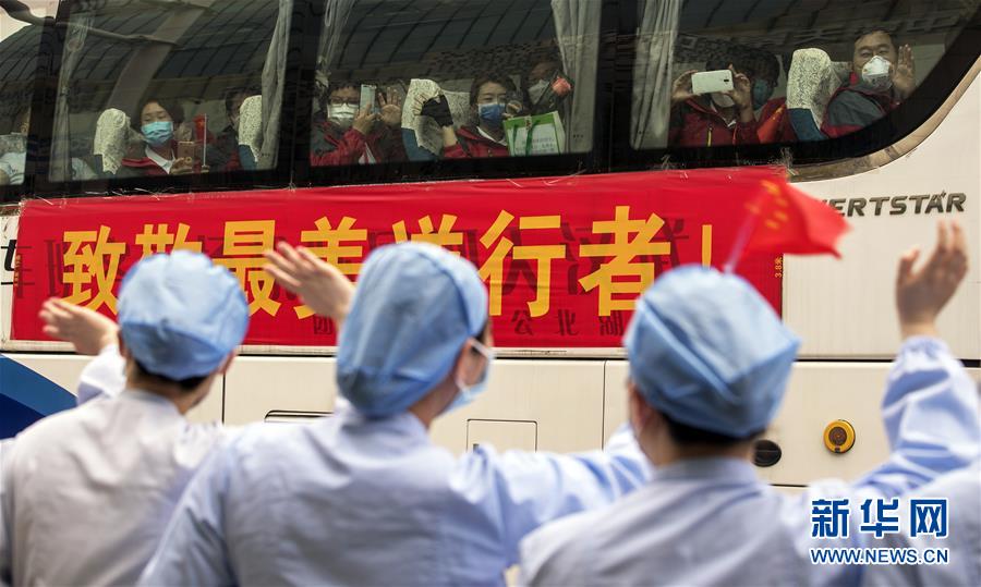 3月21日,武汉市第一医院的医护人员(前)送别天津市医疗队队员。新华社记者费茂华摄