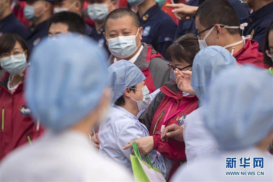 当日,武汉市第一医院的医护人员来到天津市医疗队撤离仪式现场,送别一个多月来一起抗击新冠肺炎的“战友”。随着湖北疫情形势逐步好转,根据统一安排,援鄂医疗队分批次有序撤回。从17日到20日,共有1.2万名援鄂医疗队员通过民航、铁路、公路等交通方式陆续撤离湖北。新华社记者费茂华摄